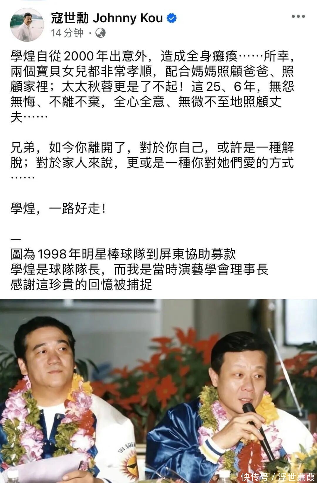 曾与其合作《一剪梅》的老戏骨寇世勋得知噩耗后,第一时间在社交平台发文悼念,称其“一生坚韧、戏品人品俱佳”,字里行间满是敬意与不舍。